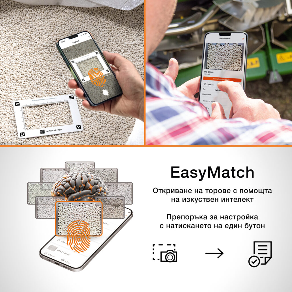 Втората отличена иновация, EasyMatch, използва изкуствен интелект (AI), за да реши един от най-сериозните проблеми при торенето – идентифицирането на правилния тор и настройката на машината. Благодарение на фотографско изображение, системата анализира над 250 физически параметъра на гранулите – размер, форма, структура и покритие – и автоматично предлага точните настройки за съответната торачка AMAZONE. С едно натискане на бутон фермерът получава прецизна препоръка, без да е необходим лабораторен анализ или дълги тестове.